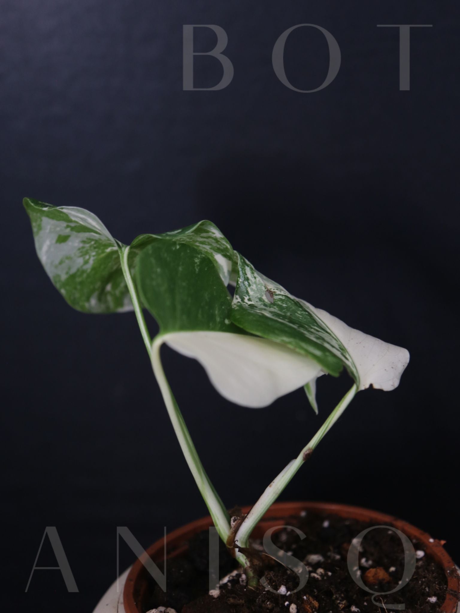 This Monstera Variegata features three exceptionally white leaves with striking, high-contrast variegation, making it a rare and highly decorative specimen. One leaf shows a clear half-moon pattern, suggesting the possibility of future half-moon leaves developing at intervals. The strong level of variegation indicates a high likelihood of continued white and visually impactful growth.